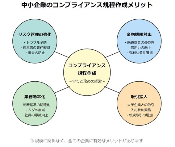 コンプライアンス規程を作成し、適切に運用することは企業が健全な経営を行うための基盤となります。従業員が問題を起こすリスクを軽減するだけでなく、対外的な信用を得るうえでも規程は有用です。