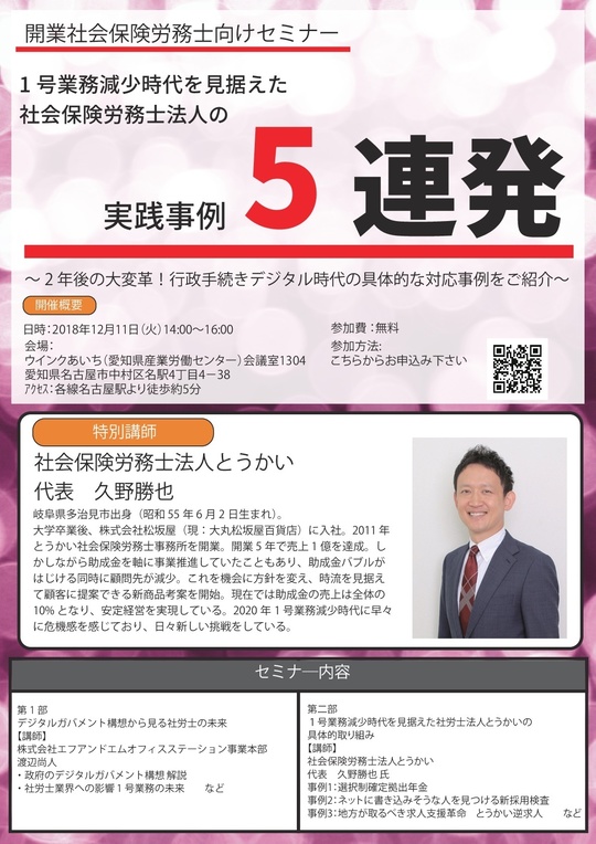 そして第二部では、1号業務減少時代を見据えて動きだしている社労士事務所経営者による今後事務所経営を支えるであろう具体的成果を伴うサービスの実践事例をご紹介いただきます。